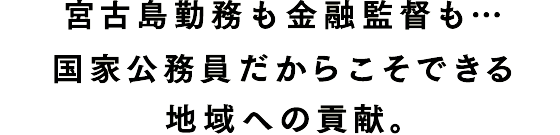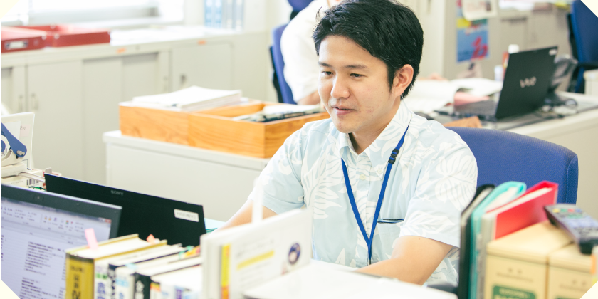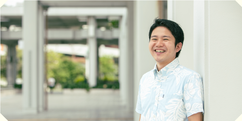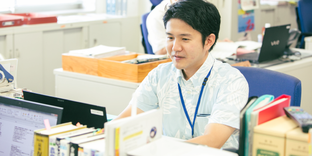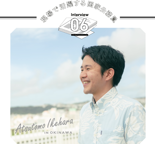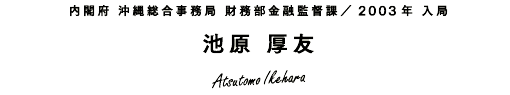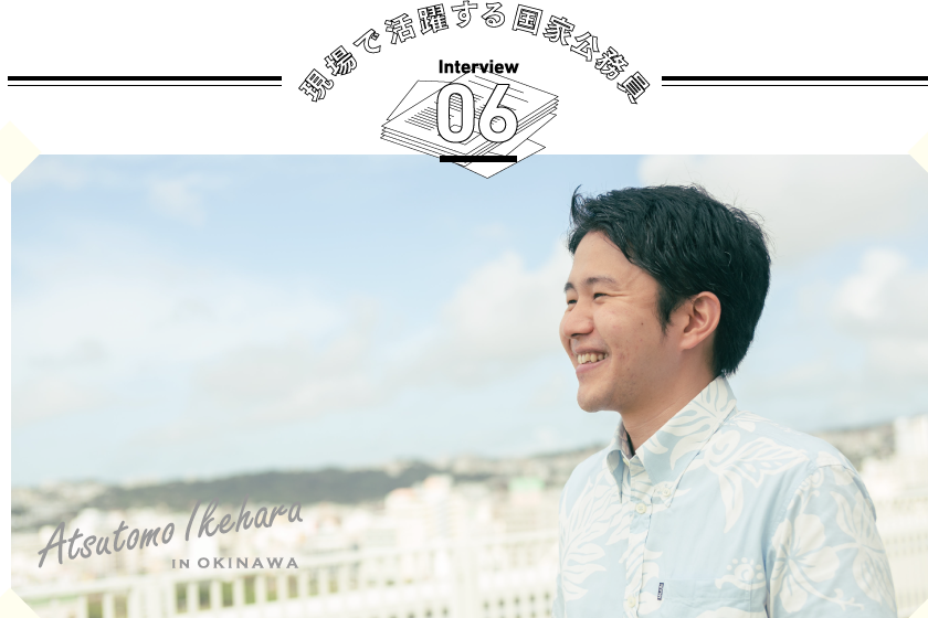 沖縄県生まれ、沖縄県育ち。沖縄の振興に貢献するために沖縄総合事務局へ入局し、財務部に配属。これまで、国有地の管理や経済動向調査、金融機関の検査や監督業務に携わる。現在の所属は金融監督課。金融機関からの情報収集などコミュニケーションを取る中で、様々な専門知識を必要とするため、日々の勉強が欠かせない。国家公務員として、国の大きな施策に携われることが魅力だと語る。