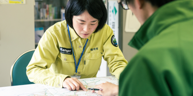 四季折々に豊かな表情をみせる森林や渓谷。苔むした山岳地帯。希少な動植物が生息・生育する湿地。色とりどりの魚で賑わうサンゴ礁。日本には世界に誇る自然風景がたくさんあります。国立公園として定められたそれらの地域を、守り伝えていくのが私たちレンジャーの使命です。みなさんは、山の中で茶色いコンビニを見かけたことはありませんか?あれは、自然の風景を損ねないよう建物の色や高さに規制をかけているんです。公園内の開発が適正に行われるよう、その許認可を出すのが私たちの仕事のひとつ。