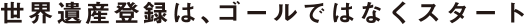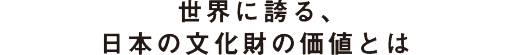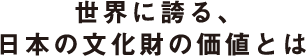 世界遺産とは、1972年にユネスコ総会で採択された世界遺産条約(正式名称『世界の文化遺産及び自然遺産の保護に関する条約』)に基づき、学術的に「顕著な普遍的価値」を有すると認められた、遺跡や景観・自然などのこと。条約締約国はそれぞれ候補物件となる暫定リストを作成し、その中から推薦する案件を世界遺産委員会に提出。調査を重ねて認められたものが、世界遺産リストに登録されることとなる。文化遺産を担当する文化庁では今日も自治体とともに、世界に誇る日本の文化財の価値を見つめ、登録に向けた準備を進めている。